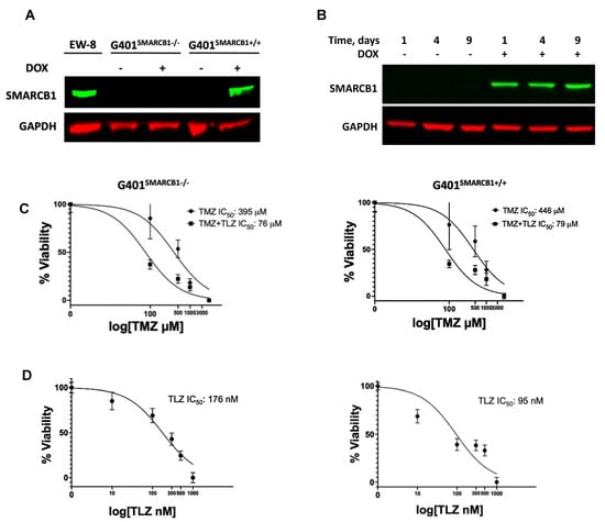The effect of TLZ and TMZ on cell proliferation in G401 isogenic cell lines with/without SMARCB1 re-expression. (A) Western blot for SMARCB1 protein in G401 isogenic cell lines. EW-8 cell line is a positive control (left lane). SMARCB1 re-expression was induced by treatment with doxycycline (DOX) for 24 h in both SMACRB1-deficient G401SMARCB1−/− and -proficient G401SMARCB1+/+ cell lines. GAPDH is a loading control. (B) Western blot demonstrating stable SMARCB1 expression induction by DOX (1 μg/mL) in G401SMARCB1+/+ cells for up to 9 days. GAPDH is a loading control. (C) Alamar Blue staining in G401SMARCB1−/− and G401SMARCB1+/+ cell lines treated with TMZ and TLZ+TMZ for 72 h. Increasing concentrations of TMZ were used alone or in combination with IC50 for TLZ for each cell line (shown in (D)). IC50 values were generated by Prism 9 GraphPad software. Confidence interval for this regression is provided in Supplemental Table S2. (D) Alamar Blue staining in G401SMARCB1−/− (left panel) and G401SMARCB1+/+ (right panel) cell lines treated with TLZ for 72 h. IC50 values were generated by Prism 9 GraphPad software. Confidence interval for this regression is provided in Supplemental Table S2. Original western blots are presented in Supplementary File S1.