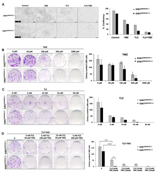 We initially examined the effect of TLZ, TMZ, and their combination on cell proliferation using IncuCyte, noting that each drug alone reduced cell confluence, with an even greater reduction when both TLZ and TMZ were used together in both isogenic lines (Figure 2A; Supplemental Figure S1). TLZ had a more substantial inhibitory effect on G401SMARCB1+/+ cells than on G401SMARCB1−/− cells. To investigate the impact of TLZ combination with TMZ on the ability of MRT cells to form multicellular colonies, we performed a colony formation assay with the G401SMARCB1−/− cell line and confirmed the results with G401SMARCB1+/+ cells. Both cell lines were exposed to various concentrations of TLZ, TMZ, and a combination of both drugs over 9 days. The SMARCB1-deficient G401 cells consistently formed more colonies compared to the G401SMARCB1+/+ cells. When normalized for colony formation, treatment with TMZ (100 μM) significantly reduced the number of colonies, but its inhibitory effect was similar for both G401SMARCB1−/− and G401SMARCB1+/+ cells, with a reduction of 31.8% and 36.8%, respectively (Figure 2B). TLZ significantly reduced colony formation in G401SMARCB1−/− at 25 nM (an 86% reduction) and in G401SMARCB1+/+ cells at 15 nM (a 48.7% reduction), while colony growth was completely abolished in both isogenic lines at 50 nM of TLZ (Figure 2C). The most significant effect was observed with the combination of TLZ and TMZ, which entirely inhibited colony formation in both cell lines at 50 μM TMZ combined with 15 nM TLZ (Figure 2D). However, treatments with 100 μM TMZ + 15 nM TLZ and 50 μM TMZ + 15 nM TLZ still allowed some colony formation in G401SMARCB1−/− cells, while no colonies formed in G401SMARCB1+/+ cells under these conditions. Although G401SMARCB1−/− cells could still form some colonies, the exposure of G401SMARCB1+/+ cells to 50 μM TMZ + 5 nM TLZ and 100 μM TMZ + 5 nM TLZ reduced colony formation by 94.4% and 96.6%, respectively (Supplemental Table S2).