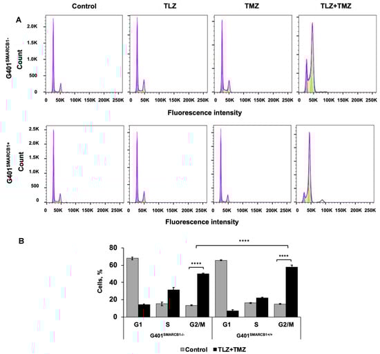 Cell cycle analysis of G401 cells treated with TLZ, TMZ, and TLZ+TMZ. (A) Effects of TLZ, TMZ, TLZ+TMZ, and SMARCB1 re-expression on cell cycle distribution in two isogenic G401 cell lines were analyzed using flow cytometry. (B) Bar charts representing percentage of cell populations in (A). ANOVA was performed with 2 factors (cell cycle stages and treatment) and their interaction. Significant changes were reported across 3 cell cycle stages (p = 2.2 × 10−16), between control and TLZ+TMZ treatments (p = 8.6 × 10−5), and their interaction (p < 2.2 × 10−16). The data are presented as mean ± SEM of n = 6–15 replicates in 2 independent tests. Asterisks **** indicate a statistical difference of p ≤ 0.0001 (t-test). These significances were confirmed with Tukey’s HSD after ANOVA.