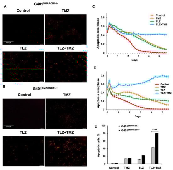 To determine the effect of TLZ, TMZ, or a combination on apoptosis, G401SMARCB1−/− and G401SMARCB1+/+ cells were pre-treated with DOX (1 μg/mL, 24 h) and cultured in the absence or presence of TMZ (IC50 = 395 μM (G401SMARCB1−/−) and IC50 = 446 μM (G401SMARCB1+/+)), TLZ (IC50 = 176 nM (G401SMARCB1−/−) and IC50 = 95 nM (G401SMARCB1+/+)), or a combination. After 72 h, apoptotic cell death was analyzed by staining with FLUO-conjugated IncuCyte Caspase 3/7 dye (Sartorius, #4704, Göttingen, Germany) according to the manufacturer’s instructions. Image scheduling, collection, and analysis were conducted with the IncuCyte S3 Live-Cell Analysis System and software (Sartorius, Bohemia, NY, USA). Treated cells were imaged hourly for 72 h. At each timepoint, 4 images were taken per well in both brightfield and RED channels. Images were analyzed for the number of red objects per well and plotted by Prism 9 software.
