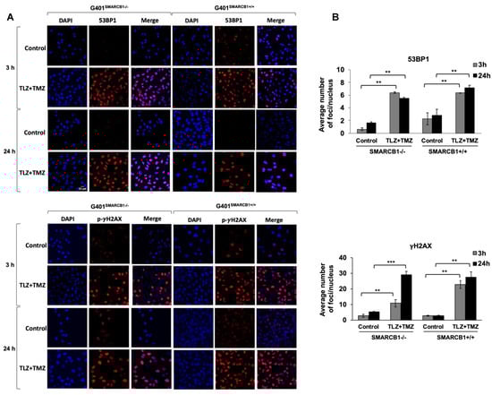 Induction of 53BP1 foci and γH2AX phosphorylation in G401 isogenic cell lines by TLZ, TMZ, and combination. (A) Representative images of G401SMARCB1−/− and G401SMARCB1+/+ cells treated with TLZ (IC50), TMZ (IC50), and TLZ+TMZ for 3 and 24 h, then stained with DAPI, 53BP1, and γH2AX phospho-protein (Ser139) primary antibodies. The images were developed using an Olympus Fluoview FV3000 confocal microscope. Magnification is 60×. Scale bar is shown in the top image (20 μm). (B) The graphs of average number of 53BP1 foci and γH2AX phospho-protein per nucleus in G401SMARCB1−/− and G401SMARCB1+/+ cells after treatment with TLZ, TMZ, and TLZ+TMZ (at IC50 concentrations) for 3, 24, and 72 h. Data are presented as mean of at least 100 nuclei ± SEM and compared by unpaired t-test; ** p ≤ 0.01; *** p ≤ 0.001 (t-test).