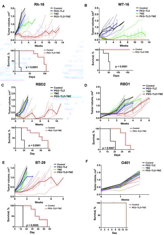 Rh-18, RBD1, RBD2, WT-16, BT-29, and G401 MRT xenograft models (developed at the St. Jude Children’s Hospital and the Nationwide Children’s Research Hospital (obtained from Peter Houghton)) (Table 1) were transplanted in immunocompromised NOD.CB17-Prkdcscid/NCrHsd female mice, which were maintained under barrier conditions and provided with the irradiated commercial pelleted diet and sterile acidified water in bottles ad libitum. In vivo experiments were conducted using protocols and conditions approved by the Institutional Animal Care and Use Committee (# 15015) at the University of Texas Health Science Center at San Antonio (UTHSCSA). All animal handling procedures were undertaken in the class 2 biological safety cabinet (BSL-2). The room temperature was maintained at 21–26 °C, with a relative humidity between 30 and 70% and a 14:10 day–night light cycle. Treatments with PEGylated TLZ (PEG~TLZ; provided by Prolynx, Inc., San Francisco, CA, USA), TMZ, or their combination were initiated when tumors reached at least 100 mm3 []. PEG~TLZ was administered at 10 μmol/kg (equivalent of 3.8 mg/kg, 0.76 mM of TLZ) as a single dose on day 1 by IP (the dose corresponds to 10 μmol of TLZ/kg; there are 4 TLZ molecules per PEG~TLZ conjugate); TMZ was given at 40 mg/kg daily for 5 days orally (PO) starting on day 3. Tolerability testing of PEG~TLZ ± TMZ dosing schedules in non-tumor-bearing mice was previously reported []. Tumor volume was determined weekly by capturing two perpendicular measurements using electronic calipers. Once a tumor reached 400% of the initial tumor volume, the study was terminated []. If the tumor volume exceeded 400% at the weekly examination, the tumor growth rate during the last week period was calculated, and the total number of days required to reach 400% of the initial tumor volume was estimated and recorded for the time-to-event analysis. The tumor volume values were used to graph the antitumor activity plots and calculate event-free survival (EFS) rates for Kaplan–Meier curves (Prism 9).