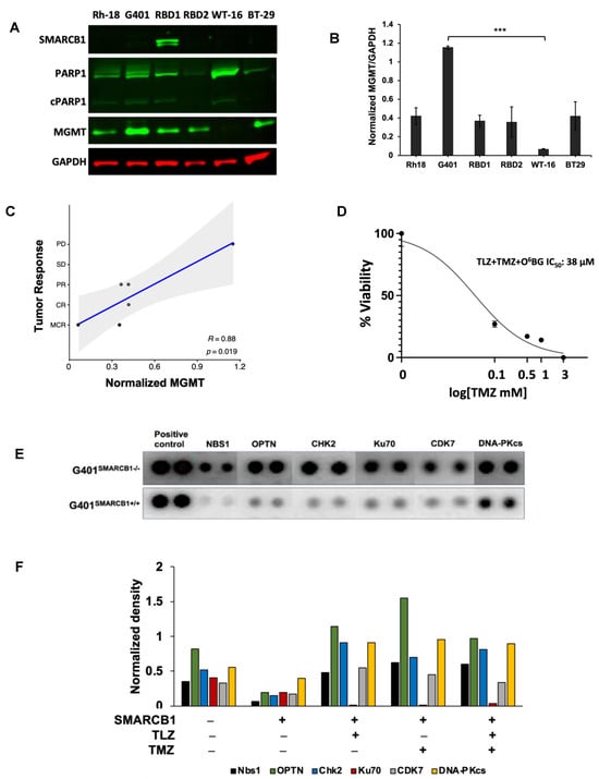 MGMT as a potential biomarker of MRT response and the therapy effect on DDR. (A) Western blot analysis of SMARCB1 (46 kDa), PARP1 (116 kDa)/cleaved PARP1 (cPARP1; 89 kDa), MGMT (21 kDa), and GAPDH (37 kDa) proteins. (B) Quantification of band intensities in (A) normalized to GAPDH loading control. One-way ANOVA was performed across 6 xenograft tumors. Significant change was reported with p = 0.0038; Tukey’s HSD further identified significant change only between G401 and WT-16 (p = 0.0022). Data are presented as mean ± SEM of 3 independent tests. Asterisks *** indicate a statistical difference of p ≤ 0.001 (t-test). (C) Inverse correlation between MGMT protein expression and the antitumor activity of PEG~TLZ+TMZ in MRT xenografts. Axis Y shows tumor response categories: 1-MCR (maintained complete response), 2-CR (complete response), 3-PR (partial response), 4-SD (stable disease), and 5-PD (progressive disease). Axis X: MGMT protein expression normalized to GAPDH. This resulted in Pearson correlation coefficient R = 0.88 with a significant p-value of 0.019. (D) G401SMARCB1−/− cell potentiation to TLZ+TMZ by MGMT inhibition. Cells were treated with increasing concentrations of TMZ (0–1 mM), TLZ IC50 (176 nM), and O6BG (25 μM). Alamar Blue was added to the plates at 72 h and incubated for 4 h; fluorescence was measured at 590 nm (excitation 530 nm) on a Clariostar microplate reader. (E) Protein array of basal levels of DDR proteins in G401SMARCB1−/− and G401SMARCB1+/+ cell lines. Blot was processed 24 h after treatment with DOX (1 μg/mL). The spliced fragments of the same blot are marked with thin white lines. (F) Plot quantitating the DDR protein expression (from the DDR protein array assay as in (E)) in G401SMARCB1−/− and G401SMARCB1+/+ cells treated with TMZ (IC50 = 446 μM for G401SMARCB1+/+ and 395 μM for G401SMARCB1−/−), TLZ (IC50 = 95 nM G401SMARCB1+/+ and 176 nM for G401SMARCB1−/−), and TLZ+TMZ for 72 h. Original western blots are presented in Supplementary File S1.
