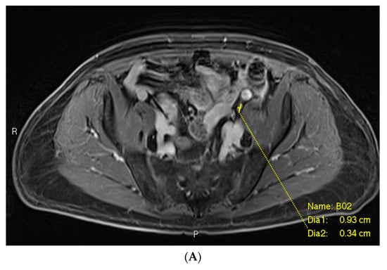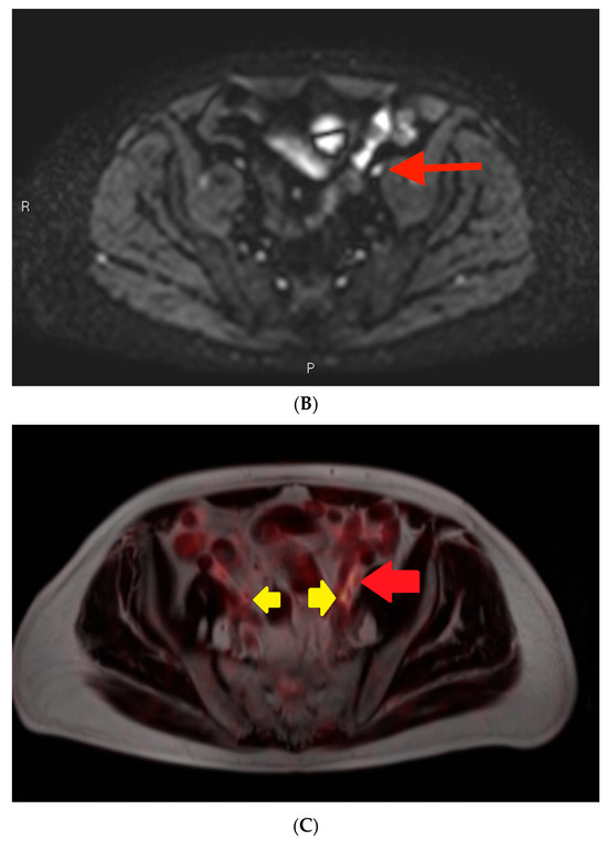 Post-contrast fat-saturated gradient T1-weighted image (A), diffusion-weighted imaging with b = 900 s/mm2 (DWI) (B), and fused PET/single-shot T2-weighted imaging (C) through the pelvis. In Figure 3A, the lesion is marked with measurement calipers. In Figure 3B,C, the lesion is denoted with a red arrow. Yellow arrows indicate the ureters, which show physiologic PSMA PET uptake.