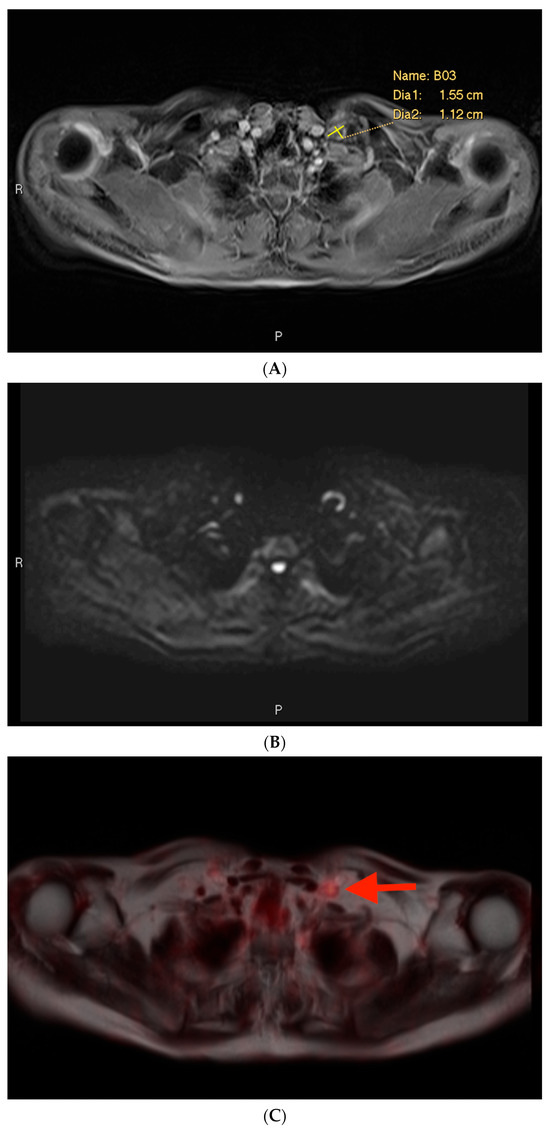 Among the cases included in this analysis, there was only one example of a characterization issue, defined as an instance where a lymph node was suspicious on MRI on the basis of size but was not prospectively included in the report (Figure 4). This case involved a lymph node metastasis. The PSMA PET showed a PSMA-avid node in the left supraclavicular region (Figure 4C). The lymph node measured > 1.0 cm in short axis (Figure 4A). However, it also exhibited a benign morphology with an oval shape and a fatty hilum.