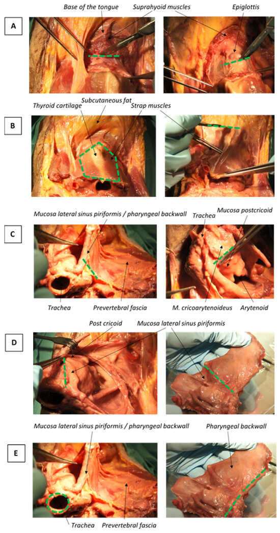 To investigate if a resection margin >5 mm (defined according to the non-organ specific RCP guideline) is feasible in the different subsites of the larynx and hypopharynx, a panendoscopy and a total laryngectomy (TL), laryngopharyngectomy (TLP) on a fresh frozen specimen were performed. A diagnostic panendoscopy of a patient with a laryngopharyngeal squamous cell carcinoma was recorded by film and photo in order to identify the different resection surfaces of the larynx and hypopharynx. A head and neck surgeon (A.S.) and two researchers identified the different resection surfaces per subsite and tumor location. Subsequently, a team of all five head and neck surgeons of the Erasmus MC and the only dedicated head and neck pathologist (S.K.) performed a TL and TLP on one intact fresh frozen head and neck specimen, specifically available for research, at the Erasmus MC skills lab. This procedure was also recorded by film and photo. During the resection, the resection surfaces per subsite and tumor location were described and measured (Figure 1). The maximum feasible resection margins (MFM) were defined as resection margins limited to 1–5 mm based on the anatomy and limited thickness of the different tissue layers at the resection surface. The MFMs were determined per tumor location and subsite in the larynx (i.e., supraglottic, glottic and subglottic) and hypopharynx (i.e., piriform sinus, postcricoid and posterior pharyngeal wall). Afterwards, the transcript of the resections and agreed MFM were discussed with the same team of head and neck surgeons and pathologist. This study was approved by the Medical Ethics Committee (MEC-2017-336).