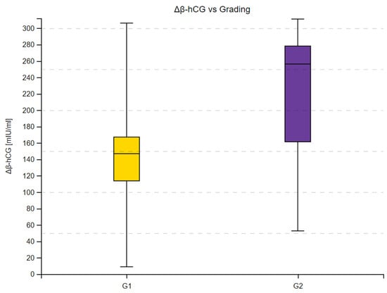 | Measuring Time Point | Median β-hCG—G1 [mIU/mL] | Median β-hCG—G2 [mIU/mL] | Sum of Ranks G1 | Sum of Ranks G2 | U | Z Corrected | p |