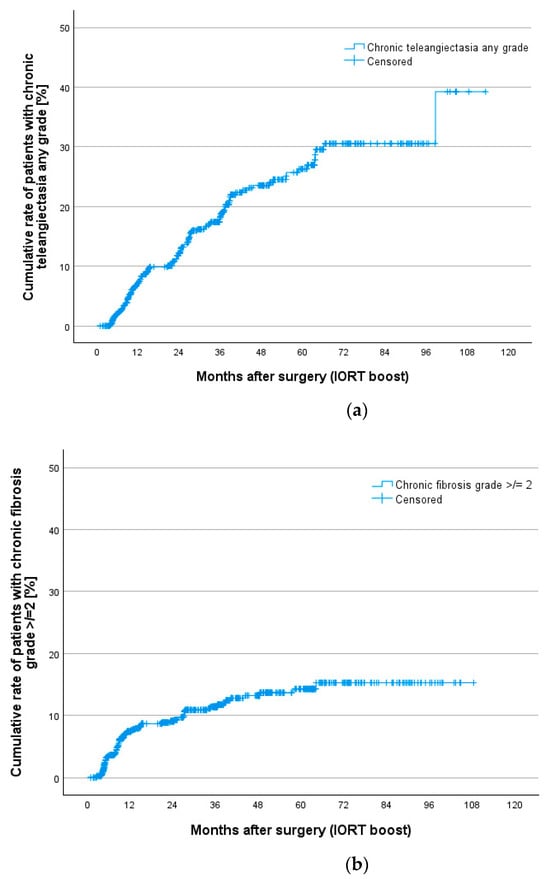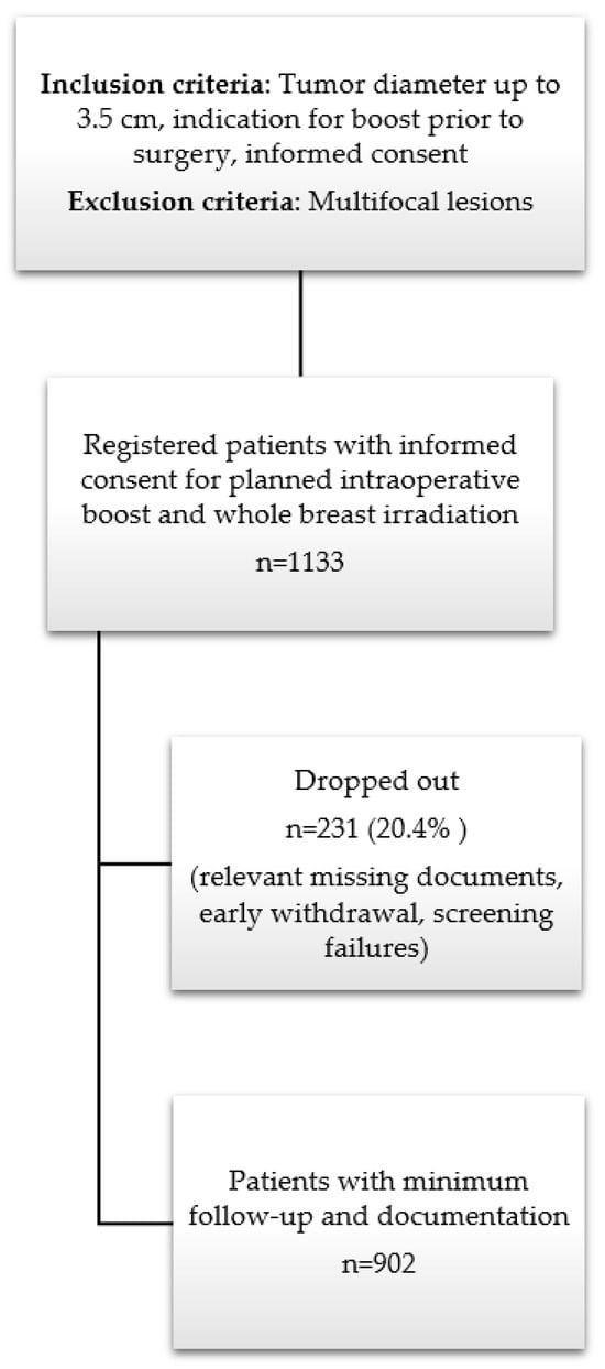 TARGIT BQR started recruitment in 2011 after approval by the local ethics committee (2011-319N-MA) and registration in clinicaltrials.gov (NCT01440010). Ten centers participated in this multicenter national registry in Germany. As this is a phase IV trial and IORT is one option for boost delivery in the German guidelines, no specific protocol is available. Patients were recruited based on predefined inclusion and exclusion criteria (Figure 1) [7,9,26]. All patients gave their informed consent prior to surgery and were planned for an anticipated boost immediately after tumor resection. Additionally, all patients were planned for whole breast radiotherapy with external beam radiation. The detailed procedure of IORT with low-kV X-rays (12–20 Gy as a single fraction with the INTRABEAM® system; Zeiss Meditec AG, Oberkochen, Germany) was already described elsewhere and EBRT was given according to standard of care procedures with conventional or hypofractioned schedules [25,27]. Systemic treatment was given according to local recommendations after discussion within the multidisciplinary tumor board. When chemotherapy was indicated, it could be given prior to surgery (neoadjuvant) or between IORT and EBRT. The recommended interval between IORT and EBRT was at least 35 days [25]. Follow-up was conducted 6 weeks after the end of EBRT, 6 months after IORT and yearly thereafter using paper-based case report forms (CRFs). Toxicity was recorded based on LENT SOMA scale [28,29]. For cumulative toxicity rates, grade 2 fibrosis, breast edema, lymphedema, hyperpigmentation, retraction, and pain were documented if they occurred at least 3 times during the follow-up period. Teleangiectasia and ulceration, irrespective of their severity, were recorded as single occurrences. Data on acute and long-term toxicity were recorded. Simple frequencies, relative and absolute values, and cumulative rates were calculated. Cumulative rates were calculated based on the Kaplan–Meier method (SAS, release 9.3, SAS Institute, Cary, NC, USA and SPSS, Version 27, IBM, Armonk, NY, USA). This is an intention-to-treat analysis of the whole cohort. All data were collected at the study center in Mannheim. The registry closed recruitment in December 2020.