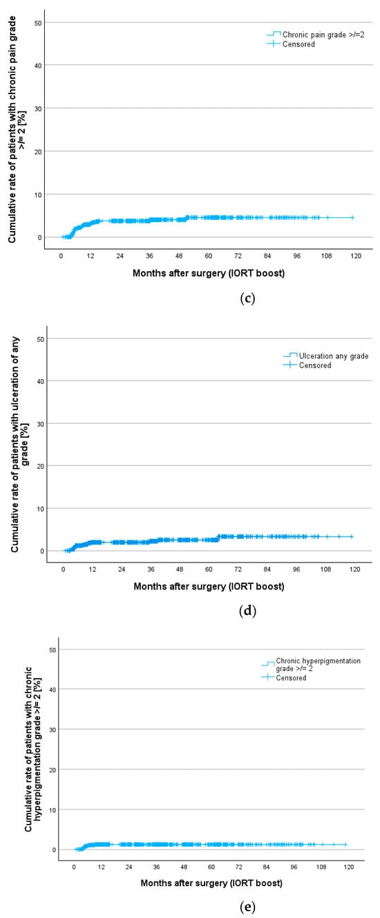 Cumulative rates for chronic toxicities after IORT boost and whole breast irradiation in the TARGIT BQR cohort according to LENT SOMA scale for (a) teleangiectasia, (b) fibrosis, (c) pain, (d) ulceration and (e) hyperpigmentation.