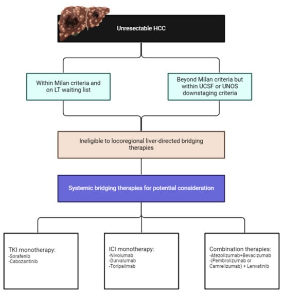 Saleh, Y.; Abu Hejleh, T.; Abdelrahim, M.; Shamseddine, A.; Chehade, L.; Alawabdeh, T.; Mohamad, I.; Sammour, M.; Turfa, R. Hepatocellular Carcinoma: The Evolving Role of Systemic Therapies as a Bridging Treatment to Liver Transplantation. Cancers 2024, 16, 2081. https://doi.org/10.3390/cancers16112081