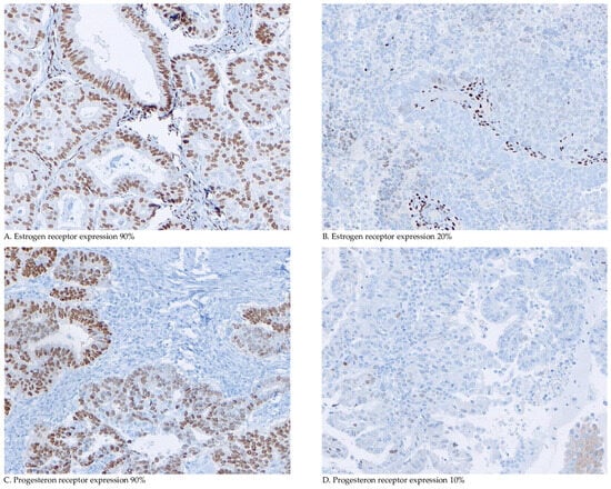 The immunohistochemical (IHC) analysis of ER and PR expression was performed on 4 µm tumour-containing sections of formalin-fixed paraffin-embedded (FFPE) tumour blocks [27]. Additional details, including the antibodies used, are provided in Supplementary Text S1 [24]. Two investigators (WvW and JB) independently assessed the percentage of tumour cells expressing nuclear ERα and PR (Figure 1). In the case of a disagreement, the final score was determined in a consensus meeting. Both reviewers were blinded to the clinical and pathological data.