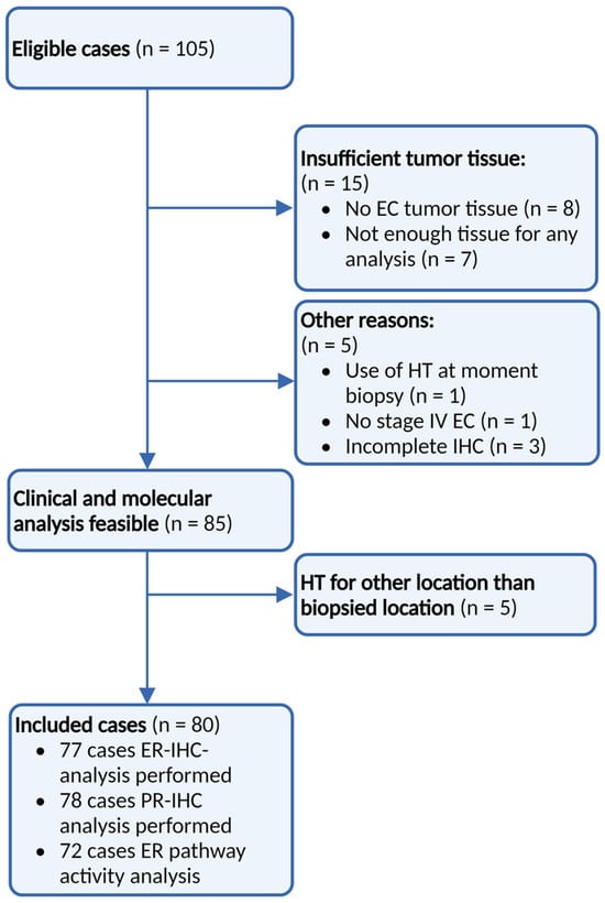 A total of 105 eligible patients were included in the PROMOTE-study (Figure 2). Due to the exclusion of cases with insufficient tumour tissue (n = 15), biopsies during HT (n = 1), stage I/II EC (n = 1), incomplete IHC analysis (n = 3), and HT were given to sites other than the biopsied site (n = 5), and a total of 80 samples were included for analysis. In two patients with recurrent EC, two different biopsies from two different sites were included.