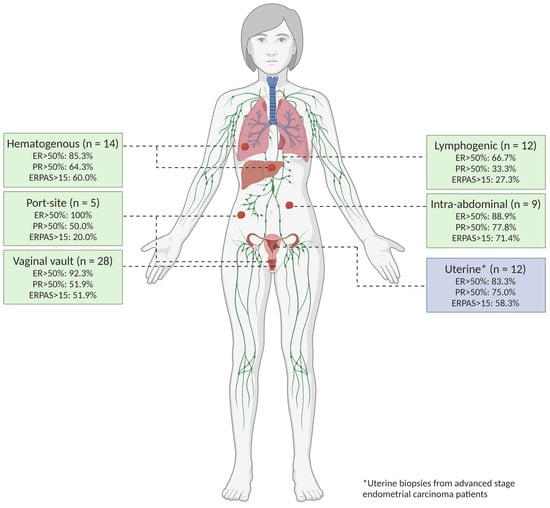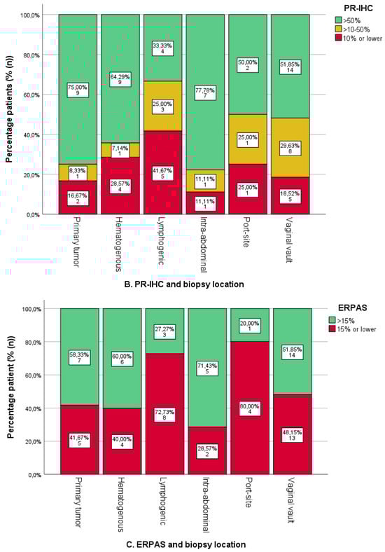 A total of 58.3% of uterine biopsies were ERPAS > 15 (Figure 4C). Lymphogenic sites were ERPAS-positive in 27.3% (n = 3/11) with port-site locations in 20.0% (n = 1/5). This was lower compared to other locations, although not significant (p = 0.294). ERPAS > 15 was the highest in intra-abdominal (71.4%, n = 5/7) and hematogenous locations (60%, n = 6/10).