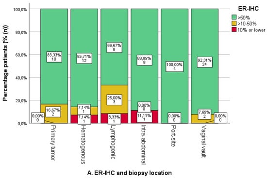 The ER-IHC expression was generally high in both uterine and metastatic locations (Figure 4A). An absence of ER-IHC expression was found in three cases of hematogenous, lymphogenic and intra-abdominal biopsies, respectively. Lymphogenic locations showed the highest proportion of ER-IHC expression <50%, yet differences were not significant.