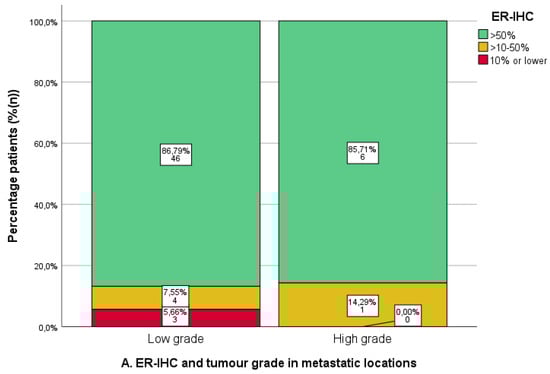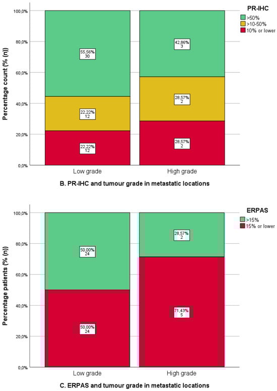 Immunohistochemical analysis of oestrogen (ER) and progesterone receptor (PR) immunohistochemistry (IHC) and ER -pathway activity score in metastatic locations in relation to tumour grade. Low grade: tumour grade 1 or 2. High grade: tumour grade 3. (A). ER-IHC expression categorised as ≤10%, 10–50%, and >50%. (B). PR-IHC expression categorised as ≤10%, 10–50%, and >50%. (C). ER pathway activity score with cut-off >15 (as the previously identified optimal cut-off value in the PROMOTE study [24]).