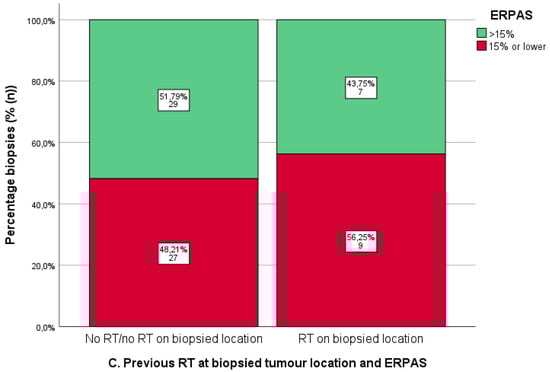 Immunohistochemistry for oestrogen receptor (ER-IHC) (A) and progesterone receptor (PR) (B) and oestrogen receptor pathway activity score (ERPAS) (C) in tumour locations with and without prior radiotherapy (RT). Predetermined cut-offs of ER-IHC and PR-IHC (>50%, >10–50%, ≤10%) and ERPAS > 15 are shown by the different categories (as the previously identified optimal cut-off value in the PROMOTE study [24]).