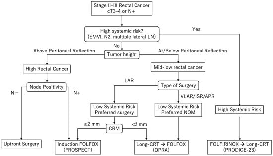 The TNT approach plays a key role in the treatment of mid and low rectal cancers. Decision making regarding the ideal treatment regimen begins with evaluating systemic risk. Given the survival benefit demonstrated by the PRODIGE-23 trial [19], induction triplet chemotherapy followed by chemoradiotherapy is recommended in patients with high-risk features for systemic recurrence (EMVI, significant lymphadenopathy, multiple lateral lymph nodes enlargement, and/or T4 tumor) with reasonable performance status. For low rectal cancer without systemic high-risk features, the regimen employed in the consolidation arm of the OPRA trial (chemoradiotherapy followed by FOLFOX) is preferred to increase the chance of organ preservation [22].