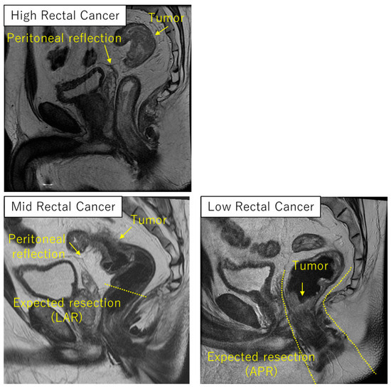 Acknowledging the limitation that this flow chart is based on our institutional interpretation of the evidence, this figure provides an example of how to clinically utilize each TNT regimen. The definitions of high, mid, and low rectum vary across the countries; European guidelines define these terms based on the distance from anal verge [8], whereas American and Japanese guidelines use a classification system based on the location in relation to the pelvic inlet and the anterior peritoneal reflection, with slight differences in their definitions [7,56]. The anatomic relationship between the tumor, peritoneal reflection, and the anorectal junction is crucial in deciding which regimen to use. At MD Anderson Cancer Center, tumor location of the rectum is categorized per the NCCN guideline; high rectal cancer above the peritoneal reflection below the pelvic inlet, mid rectal cancer at the peritoneal reflection, and low rectal cancer below the peritoneal reflection (Figure 2). The typical expected procedure for mid and high rectal cancer is a low anterior resection with the anastomosis above the anorectal junction, whereas the procedure for low rectal cancer is a very low anterior resection with the anastomosis below the anorectal junction or coloanal anastomosis, or abdominoperineal resection.