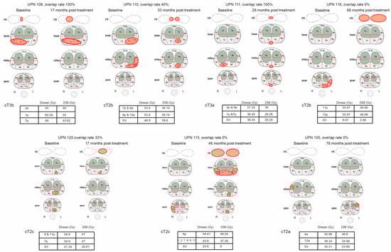 Intra-prostatic recurrences occurred in seven patients (21%), and the median time from diagnosis to local recurrence was 33 months (range: 17–76 months). We computed 100% overlap in two patients, a partial overlap in two others, and no overlap in the remaining three. Recurrent tumors received a median Dmean of 42.57 Gy (range 8.67–60.59 Gy) and D98% of 36.09 Gy (range: 2.88–55 Gy). Interestingly, the seminal vesicles were affected in all recurrent tumors except one. Figure 1 describes the location of the DIN in each individual patient as well as the site of recurrence with their respective overlap rate and Dmean/D98% doses administered.
