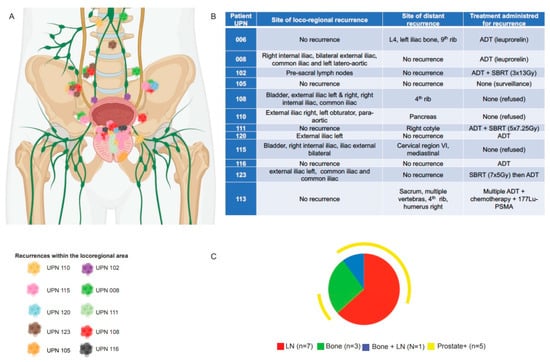 Locoregional recurrences in individual patients. (A) Anatomical location of locoregional recurrences; each color represents one patient (UPN, unique patient number). (B) The table highlights the specific site of locoregional recurrence for each patient, as well as the site of distant metastases and the appropriate treatment received at recurrence. (C) The Spice graphic was generated using Spice software (V6). The graph illustrates the overlap of locoregional and distant metastases: bone metastases are depicted in green, lymph node metastases in red, and both bone and lymph node metastases in blue. The yellow circuit represents prostate recurrences, which did not occur in isolation but in conjunction with locoregional and/or distant metastases.
