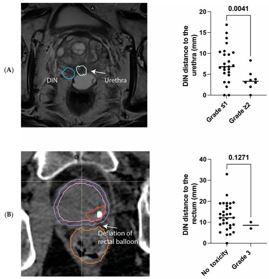 Panel (A): Scatter plot of individual patient’s values depicts median distance between DIN and urethra in patients with or without late grade ≥ 2 genitourinary toxicity. Image shows the baseline MRI of a patient with grade 2 late urinary toxicity. Panel (B): Scatter plot of individual patient’s values depicts median distance between DIN and rectum in patients with or without grade 3 late gastrointestinal toxicity. Image shows planning CT of a patient with grade 3 late gastrointestinal toxicity (fecal incontinence), demonstrating the deflation of his rectal spacer.