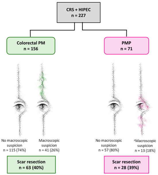 Figure 1. Frequency of macroscopic suspicion of scar metastases and scar resection in patients with colorectal peritoneal metastases (PM) or pseudomyxoma peritonei (PMP), treated with cytoreductive surgery (CRS) and hyperthermic intraperitoneal chemotherapy (HIPEC). a For one patient, the surgeon clearly wrote that there was uncertainty regarding whether there was macroscopic suspicion or not. This patient could not be categorized as macroscopic suspicion or no macroscopic suspicion.