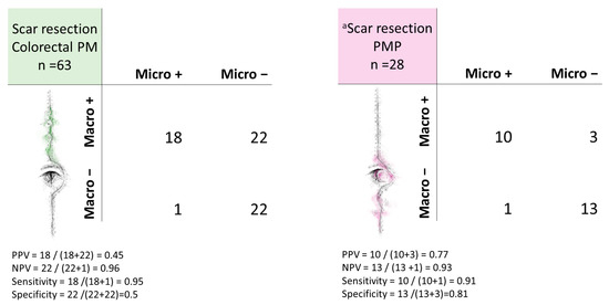 Figure 2. Cross-tabulations of macroscopic suspicion of scar metastases versus microscopic results in patients with colorectal peritoneal metastases (PM) or pseudomyxoma peritonei (PMP). a For one patient, the surgeon clearly wrote that there was uncertainty regarding whether there was macroscopic suspicion or not. This patient could not be categorized as Micro+ or Macro−, and excluded from the cross-tabulations. This patient had microscopically confirmed scar metastasis. PPV; positive predictive value, NPV; negative predictive value, Macro; macroscopic suspicion, Micro; histopathological result.