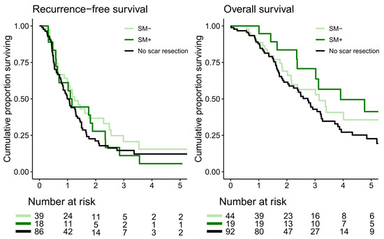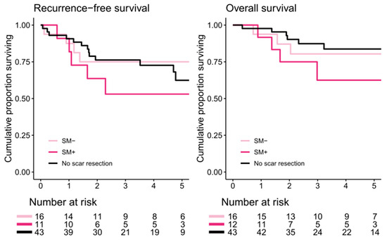 In PMP patients, there was no difference in 5-year RFS in those who had confirmed SM (53%; 95% CI 30–94) compared with in those without SM (75%; 95% CI 57–100, p = 0.3). Patients without scar resection had a 5-year RFS of 62% (95% CI 47–83). There was no difference in RFS between those who underwent scar resection and those who did not (p = 0.7). In one patient, recurrence information was missing. This patient was not included in the RFS analysis. Five-year OS in patients with SM was 63% (95% CI 39–100) and that in those without SM was 80% (95% CI 63–100; p = 0.4). Patients without scar resection had a 5-year OS of 84% (95% CI 72–97). There were no differences in survival rates between those who underwent scar resection and those who did not (p = 0.7, Figure 4).