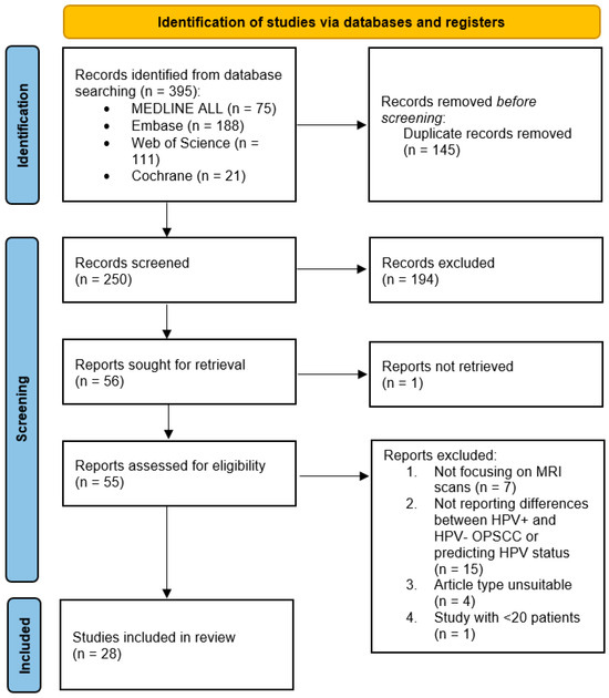 A computerized search was conducted of EMBASE, MEDLINE ALL, Web of Science, and Cochrane databases on 15 December 2022, to identify original articles published up to December 2022. This review was performed in accordance with the preferred reporting items for systematic reviews (PRISMA) guidelines and has not been registered [33]. The search terms were “OPSCC”, “MRI”, “HPV”, and their synonyms (the full search strategy for reproducing the search can be found in Supplementary Data S1).