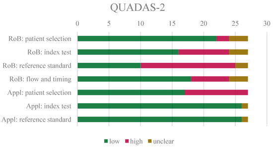 Overview of QUADAS-2 results. RoB = risk of bias; Appl = applicability.