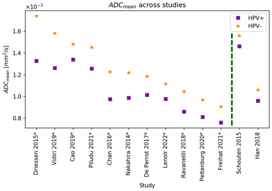 Mean apparent diffusion coefficient (ADCmean) of HPV+ and HPV− lesions with decreasing ADC for HPV− from left to right. If median was reported instead of mean, we used the median. Asterisks (*) denote a significant difference between HPV+ and HPV− groups [2,25,27,28,29,38,39,41,42,44,45,46,49]. A significant difference between HPV+ and HPV− lesions was found in all studies (left of the dashed line), except for Schouten et al. and Han et al. [28,49].