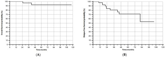 As reported in Figure 2B,C, the RFS of the entire population treated with PONA was very good (71% at 60 months), with a significantly better RFS in the prophylactic group (95% vs. 57%, p = 0.02), despite the fact that, in the pre-emptive group, in addition to PONA, DLI was administered in 10/22 (45%) of patients (while no cases received DLI in the prophylaxis group) [25].