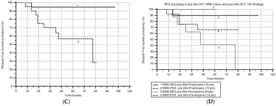 The mean and median follow-up times after Allo-SCT were 40 ± 26 and 34 months (range 7.7–118), respectively. The cytologic relapse rate under PONA maintenance therapy was 17% (8/48), with seven events in the pre-emptive group and only one event in the prophylactic group (p = 0.017). The 5-year probability of OS and RFS after Allo-SCT was 92% and 71%, respectively (Figure 2A,B). The 5-year RFS after Allo-SCT of pts who received PONA as prophylaxis was 95%, and it was 57% for those who received PONA pre-emptively (log-rank p = 0.02) unless that the pre-emptive group received, in addition to PONA, the DLI in 45% of cases (10/22) (Figure 2C). As reported, the median RFS was not reached in the prophylactic group, and it was 81 months in the pre-emptive group (Figure 2C). The RFS, according to the pre-Allo-SCT MRD status (pos or neg) and to the post-Allo-SCT PONA strategy (prophylaxis or pre-emptive), was reported in Figure 2D.