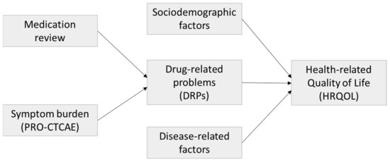 With this analysis, we aimed to assess medication risks in cancer inpatients and determine sociodemographic, disease-related, and drug therapy-related factors influencing HRQOL in oncology inpatients. A scheme of the study framework is shown in Figure 1.