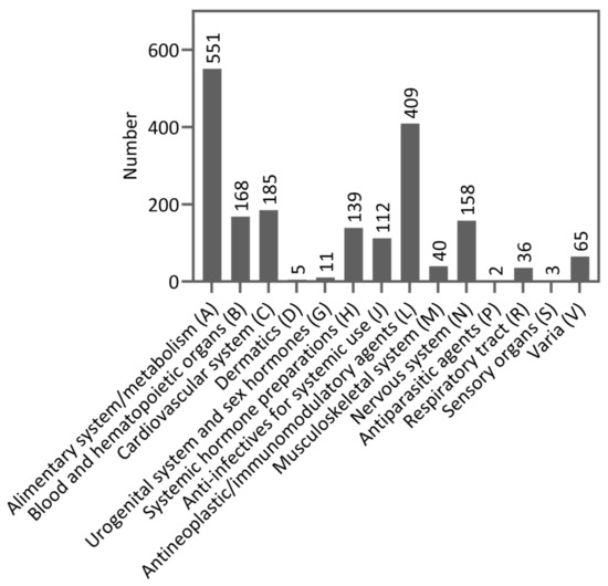 Drug classes categorized by Anatomical Therapeutical Chemical (ATC) code level 1 (n = 1884).
