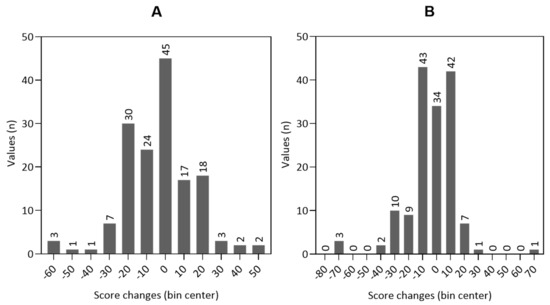 The minor changes in scores, that can be considered clinically meaningful for patients, are called minimal important differences (MIDs). For the EORTC QLQ-C30 questionnaire, the MIDs for the global HRQOL and its subscales were evaluated in different studies [51,52,53]. As an approximation, values between five and ten can be assumed small patient-relevant changes. Values between 10 and 20 indicate a moderate difference, and values above 20 indicate a significant difference [54,55]. Therefore, it is possible to consider that all patients distributed to bin centers ±10 or higher experienced patient-relevant changes in their HRQOL (see Figure 4).