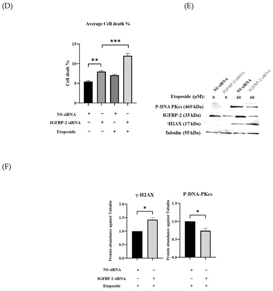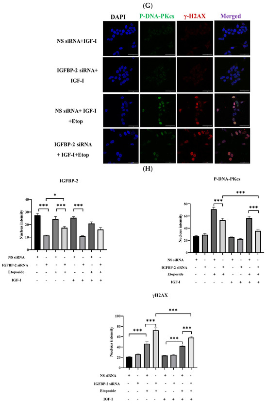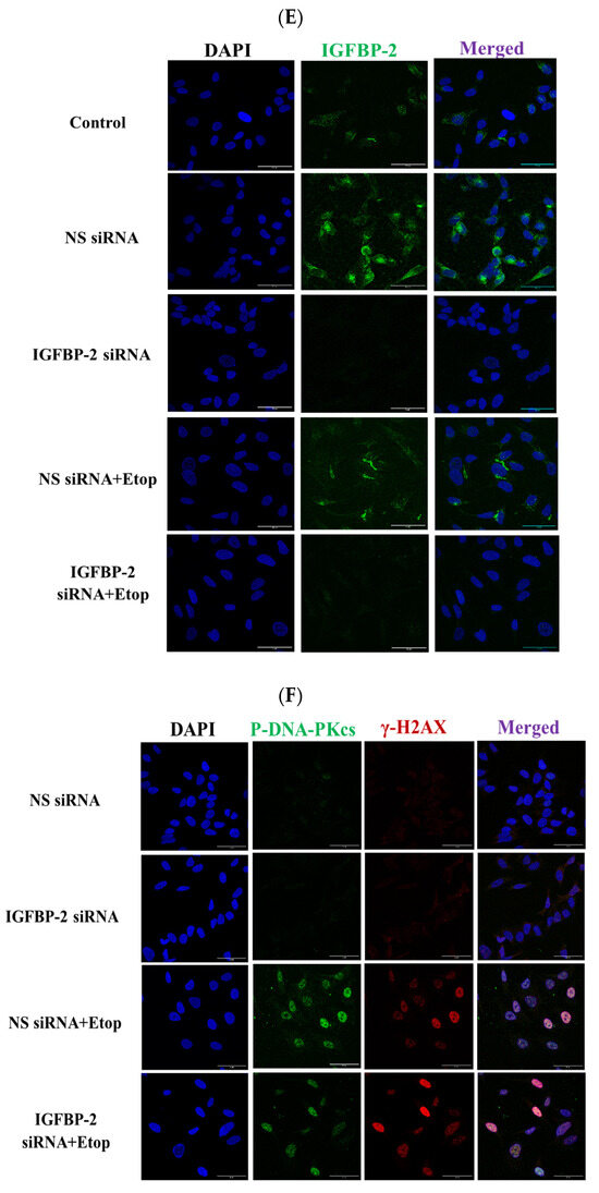 ER-positive MCF-7 and T47D cells secrete high levels of IGFBP-2 and so, to manipulate the levels to determine the role of IGFBP-2 in DNA repair, siRNA silencing of IGFBP-2 was performed. Silencing IGFBP-2 alone increased death by 8.8% (p < 0.001) and etoposide alone increased death by 6.4% (p < 0.001) compared with the control in MCF-7 cells. In combination, an additive increase in death of 15.8% (p < 0.001) (Figure 1A) was observed. Exposure to etoposide was associated with an increase in P-DNA-PKcs levels, which was decreased when IGFBP-2 was silenced (p < 0.001). Silencing IGFBP-2 or the presence of etoposide each alone increased levels of γH2AX abundance, and silencing IGFBP-2 with etoposide had an additive effect (Figure 1B,C). Similar data, in addition to immunofluorescence, were obtained with an additional ER-positive breast cancer cell line, the T47D cells (Figure 1D–F and Figure 2). The immunofluorescence data confirm that nuclear abundance of P-DNA-PKcs and γH2AX is increased by etoposide. When IGFBP-2 is silenced, etoposide-induced P-DNA-PKcs is reduced and γH2AX is enhanced (Figure 2).