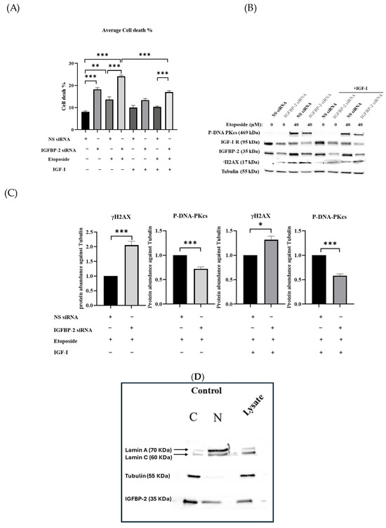 IGFBP-2 silencing in MCF-7 cells with or without IGF-I and etoposide. (A) Shows the mean of percentage cell death. (B) Western blot analysis of cell lysates of MCF-7 cells when IGFBP-2 siRNA is present and absent and 10 ng/mL IGF-I treated with and without etoposide (40 µM) for 23 h. As a loading control, tubulin was used. (C) Optical densities of MCF-7 lysates of treated cells expressed as relative fold change after correcting to tubulin and normalising to 1 (where * p < 0.05, ** p < 0.01 and *** p < 0.001) of three independent experiments each repeated in triplicate. (NS = non-silencing). One-way ANOVA was used for statistical analysis. (D) Nuclear (N) and cytoplasmic (C) fractions of MCF-7 cells were analysed by Western blotting. As nuclear and cytoplasmic loading controls, lamin A/C and tubulin were used, respectively. (E–G) Immunofluorescence staining of IGFBP-2 (green), P-DNA-PKcs (green), and γH2AX (red) in MCF-7 cells. FIJI/Image J was used to process the images (scale bar = 50 μm). Three independent experiments were performed with each repeated in triplicate. (H) Quantification of intensity of immunofluorescence within the nucleus for IGFBP-2, P-DNA-PKcs, and γH2AX in MCF-7 cells. Immunofluorescence images was analysed by Fiji-image J program, which measures the fluorescence intensity of each protein inside the nucleus. Three independent experiments were performed with each repeated in triplicate. Original western blots are presented in File S1.
