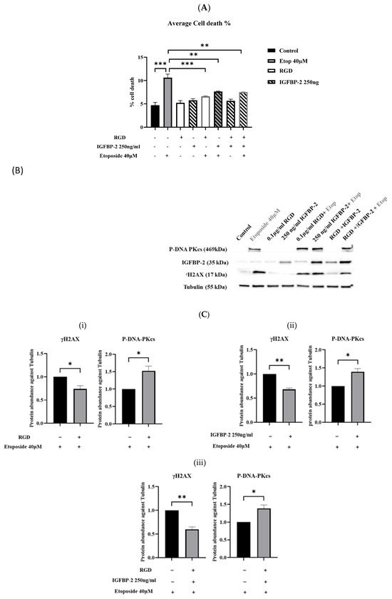 MDA-MB-231 cells dosed with recombinant IGFBP-2 with or without etoposide in the presence or absence of RGD. (A) Shows mean of percentage cell death in MDA-MB-231 cells pre-dosed with recombinant IGFBP-2 (250 ng/mL) for 4 h and RGD (0.1 µg/mL) for 1 h, treated with and without etoposide (40 µM) for 19 h. Results shown are the mean +/− SEM of three independent experiments each repeated in triplicate. (B) Representative Western blot analysis of cell lysates repeated three times. (C) Optical densities to measure γH2AX and P-DNA-PKcs in MDA-MB-231 cell lysate treated with (i) RGD and etoposide, (ii) IGFBP-2 and etoposide, and (iii) IGFBP-2 and RGD compared with etoposide alone, after correcting for tubulin and normalising to 1 (where * p < 0.05, ** p < 0.01 and *** p < 0.001). Original western blots are presented in File S1.