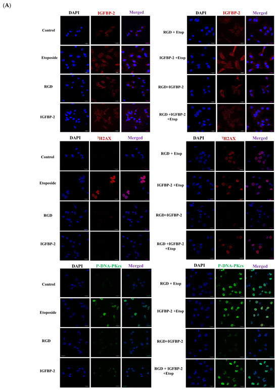 To investigate whether the actions of IGFBP-2 were integrin-mediated, an RGD-containing peptide was used. Both exogenous IGFBP-2 and RGD significantly reduced etoposide-induced cell death, but it was not reduced further when IGFBP-2 and RGD were added in combination (Figure 5A). There were no significant reductions in total cell number with any treatment (Supplementary Figure S1B). In the absence of etoposide, RGD and exogenous IGFBP-2 had no effect on γH2AX, while etoposide alone increased γH2AX levels and increased those of P-DNA-PKcs significantly. RGD and IGFBP-2 each in combination with etoposide resulted in a reduction in γH2AX and an increase in abundance of P-DNA-PKcs (Figure 5B,C(i,ii)). There was no additive effect when RGD and IGFBP-2 were added in combination with etoposide (Figure 5B,C(iii)). Immunofluorescence indicated that IGFBP-2 was effectively added and that it was present in both the nuclear and cytoplasmic areas of the cells. The pattern of changes in levels of γH2AX and P-DNA-PKcs following treatment was similarly observed using IF (Figure 6A,B).