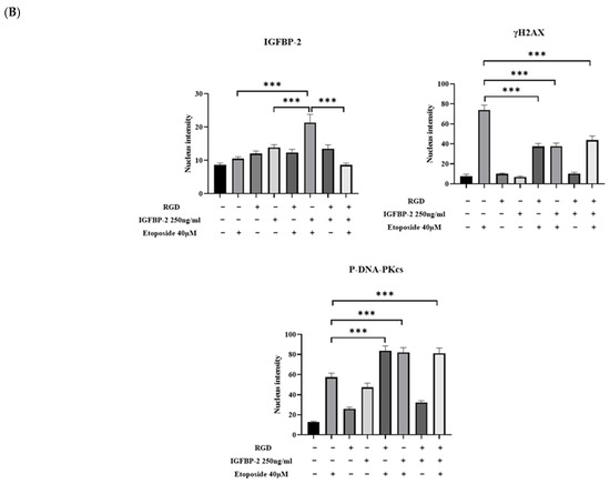 Immunofluorescence staining of MDA-MB-231 cells in the presence and absence of recombinant IGFBP-2 (250 ng/mL) for 4 h and RGD (0.1 µg/mL) for 1 h, treated with and without etoposide (40 µM) for 19 h (scale bar = 50 μm). (A) Immunofluorescence staining of IGFBP-2 (red), γH2AX (red), and P-DNA-PKcs (green). (B) Quantification intensity of immunofluorescence within the nucleus for IGFBP-2, γH2AX, and P-DNA-PKcs. Results shown are the mean of three independent experiments. Immunofluorescence images were analysed by Fiji-image J program that measures the fluorescence intensity of each protein inside the nucleus (where *** p < 0.001).