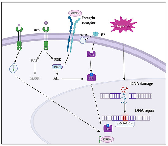 After examining the impact of IGFBP-2 on DNA damage induced by etoposide in estrogen-receptor-positive breast cancer cells, the study extended its investigation to triple-negative breast cancer cells (TNBC), characterised by the absence of ER, PR, and HER2 (a member of the EGFR family) [40,43]. Notably, when exposed to exogenous recombinant IGFBP-2, the MDA-MB-231 cells exhibited enhanced DNA repair mechanisms and an upregulation of DNA-PKcs leading to greater resistance to etoposide, and suggested a protective role for IGFBP-2. This finding indicates that IGFBP-2 can interact with DNA-PKcs in the absence of ER and aligns with the hypothesis that IGFBP-2 mitigates DNA damage by enhancing the DNA repair mechanism. To determine whether exogenous IGFBP-2 was acting intrinsically through integrin receptors, exogenous IGFBP-2 was added with or without a disintegrin peptide, RGD. Strikingly, the study revealed that RGD had a similar effect to exogenously added IGFBP-2, resulting in improved DNA repair efficiency and reduced DNA damage in treated cells compared to those treated with etoposide alone. This suggests that IGFBP-2 and RGD may have a similar mechanism of action, likely dependent on integrin signalling, but whether IGF influences this is yet to be determined. Integrin signalling has been shown to promote DNA repair via NHEJ [44], and it is widely reported that the IGF-independent actions of IGFBP-2 are via activation of integrin signalling [45,46] (Figure 7).