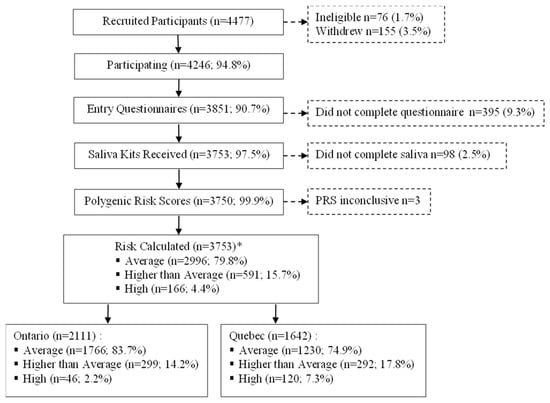 Recruitment and data collection of Quebec and Ontario PERSPECTIVE I&I participants aged 40–69 years. Abbreviations: polygenic risk score (PRS). * Risk estimated without PRS for n = 3.