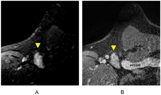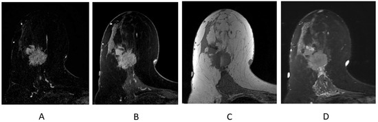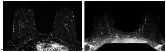 Lesion detection is largely performed on T1-weighted dynamic contrast-enhanced (DCE) sequence images. Prior to DCE sequences, a T1-weighted non-fat-suppressed sequence is typically acquired. Subsequently, pre- and post-contrast T1-weighted fat-suppressed dynamic contrast-enhanced (DCE) sequences are obtained at multiple time points. The creation of subtraction images—a post-processing technique whereby the pre-contrast sequence is “subtracted” from the post-contrast sequences—is required for DCE imaging obtained without fat suppression (Figure 2A). A maximum-intensity projection (MIP) can also be generated from these subtraction images (Figure 2B) and can assist in efficient lesion detection [26]. It is important to note that artifacts (motion, chemical shift, poor fat suppression) may degrade these post-processed sequences.