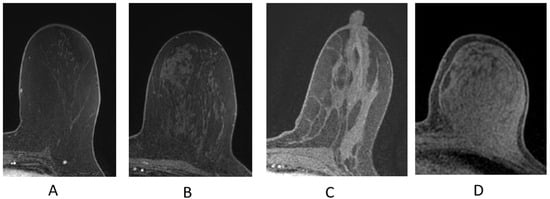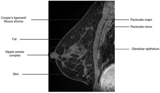 The breast is composed of glandular epithelium, fibrous stroma, and fat. The glandular epithelium in the breast consists of two main building blocks: ducts and lobules. Together, the ducts and lobules form ductal-lobular units, which coalesce to form approximately 15–20 lobes in a breast. Each lobe leads to a duct that widens to form a lactiferous sinus under the nipple–areolar complex prior to exiting the nipple. The fibrous stroma—frequently referred to as Cooper’s ligaments—is composed of bands of connective tissue that traverse the breast and insert into the dermis. These basic structures are seen at breast MRI (Figure 3). The amount of fibroglandular tissue (FGT) is evaluated on T1-weighted (either on the fat-saturated or non-fat-saturated) breast MR imaging sequences (Figure 4) [35].