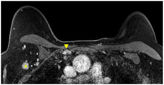 Axial T1W fat-suppressed post-contrast breast MRI provides a global view of the axillary and internal mammary nodal basins. In this case, level I axillary adenopathy (asterisk) and internal mammary adenopathy (arrowhead) are present.