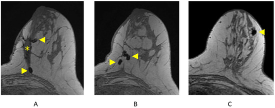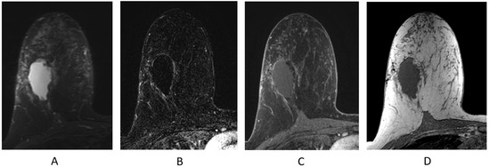 The standard breast MRI protocol includes a fluid-sensitive sequence, most commonly either an axial T2-weighted (with or without fat suppression) or a short-tau inversion recovery (STIR) sequence. Although some cancers may demonstrate high signal intensity on fluid-sensitive sequences (necrotic cancers, mucinous carcinomas, and metaplastic carcinomas), most masses with high signal intensity on a fluid-sensitive sequence are benign (cysts, seromas, lymph nodes, and fibroadenomas). Studies have demonstrated that fluid-sensitive imaging increases the specificity in distinguishing benign and malignant lesions [27,28,29,30,31,32].