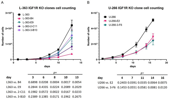 Proliferation curves of different IGF1R-knockout clones of the HMCL (A) L-363 (clones B4, and E9 (exon 18-targeted), 2-C11, 3-B10 (exon 2-targeted)) and (B) U-266 (clone 3-F6 (exon 2-targeted) and E2 (exon 18-targeted)) in comparison to the respective wild-type cells. All the results were revealed by at least three independent experiments. The statistical test was a two-tailed unpaired t-test. The p values are summarized below the curves.