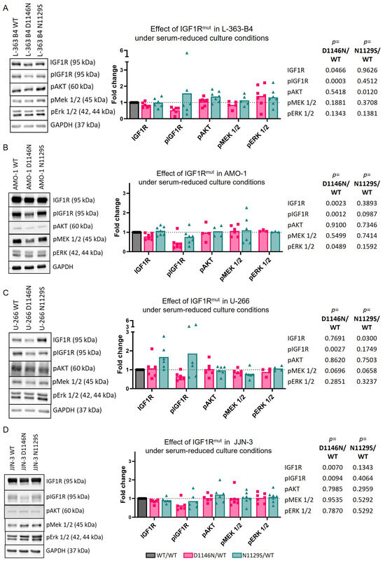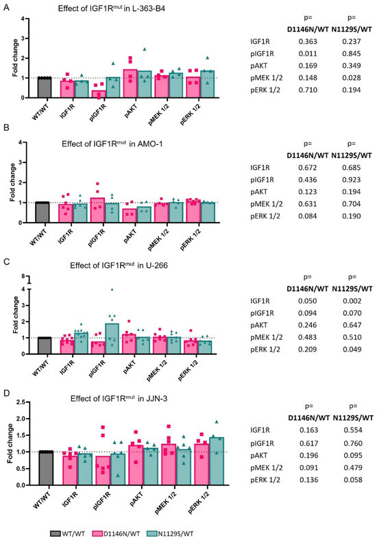 RTK mutations can be a decisive factor in tumor progression and targeted treatment approaches [20,23,48,49,50] and are associated with inferior survival in MM. Therefore, we investigated whether the L-363 mutation IGF1RD1146N or the MM patient-derived mutation IGF1RN1129S (for details, see Section 2 and Table S1) alter the activation of the classical RTK effectors.