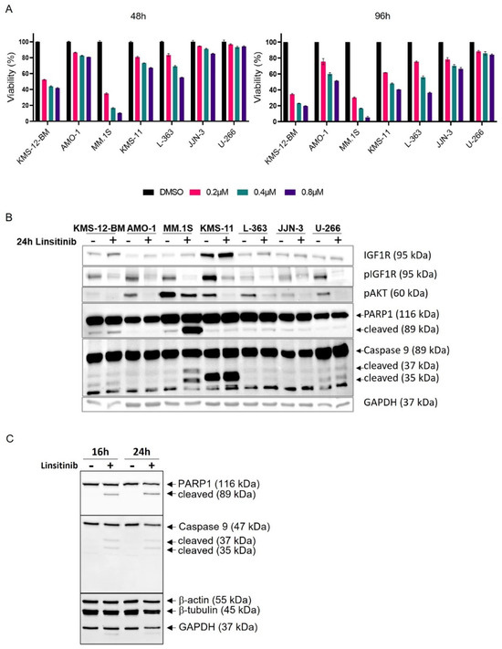 Treatment of HMCLs with linsitinib (Lin). Effect on metabolism and signaling was assessed using (A) MTT-assay and (B,C) Western blot analysis. MTT assays after 48, 72 and 96 h were performed in technical triplicates (mean ± SEM) (for 72 h values, see Figure S7). Viability is relative to DMSO control. (C) PARP-1 and caspase 9 cleavage in MM.1S after 16 h and 24 h. Different proteins were assessed on separate parts of the same blot or on different blots.